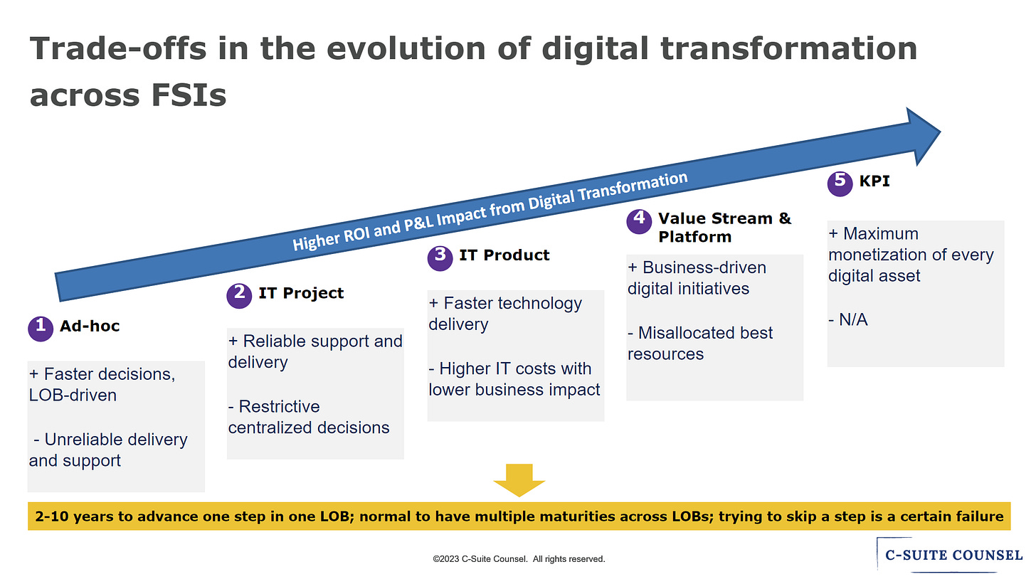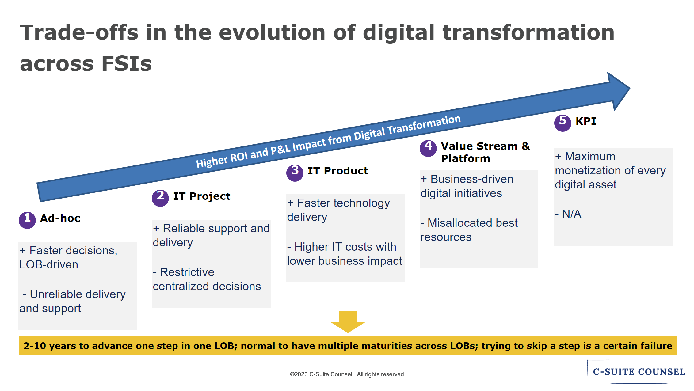 Many FSIs fail to grasp that digital transformation involves the challenging process of reshaping business and operating models. Instead, they often label any substantial digital endeavor as "transformative" without delving into its trade-offs. This is akin to proponents of solar and wind energy who overlook downsides such as increased manufacturing pollution and harm to flora and fauna in the vicinity. However, the consequences of not honing in on specific digital transformation trade-offs are substantial, all the way till reaching the target state.